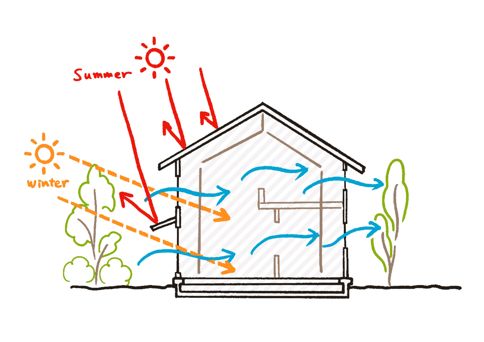 建物配置や開口部の向きを工夫し、太陽の熱と光を最大限に活用。昼間の自然採光/日射取得で、さらに冷暖房負荷を軽減します。