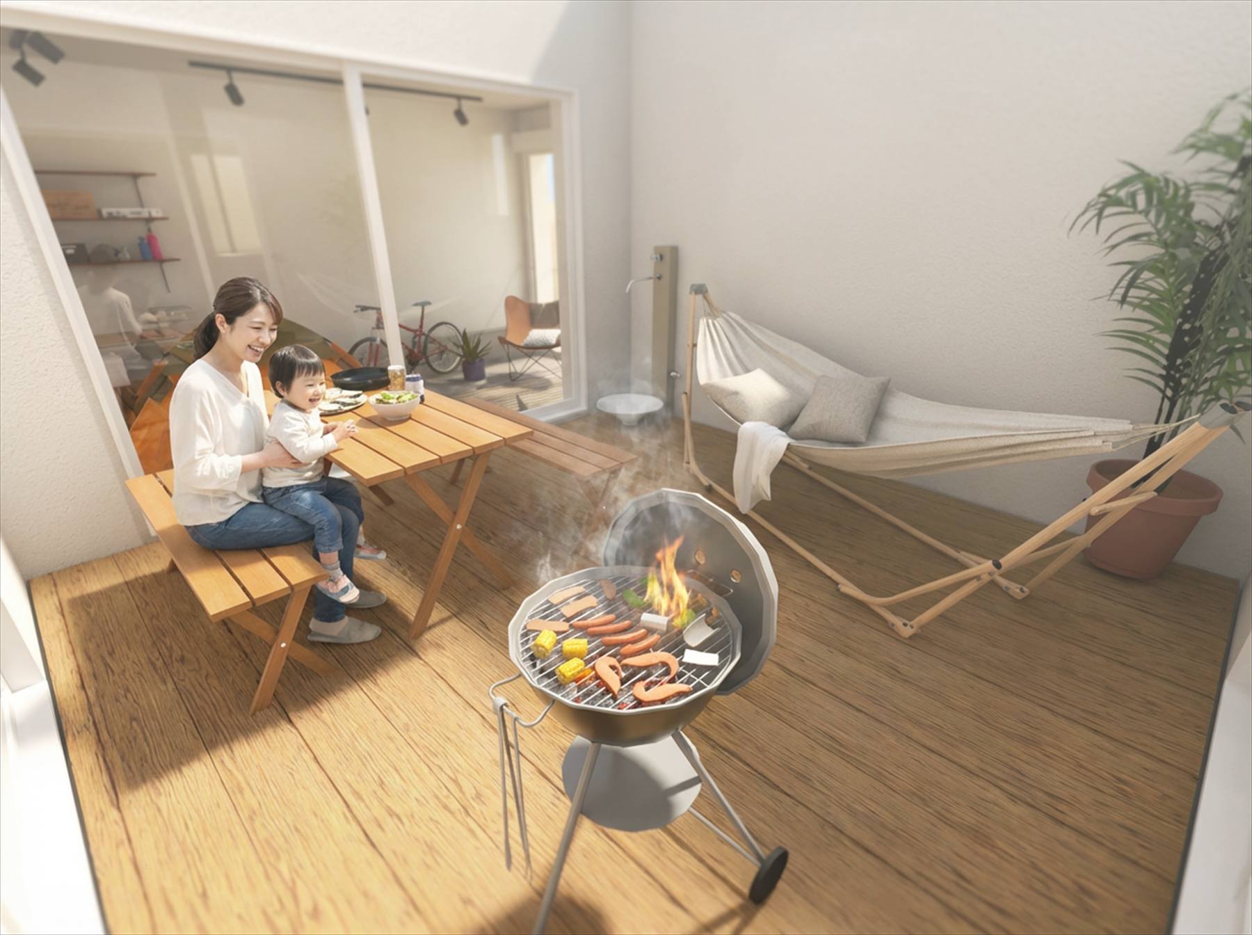 隣接建物の窓位置を事前調査し、どこからも見えないよう中庭テラスを配置。プライバシーが守られたテラスで家族だけの特別な時間を過ごせます。